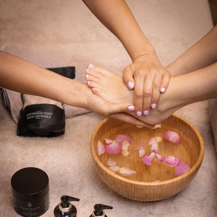 Jalkahoito Purodoré Spa tarjoaa täydellistä hemmottelua jaloille. Jalat hoidetaan pehmeiksi ja kevyen tuntuisiksi sekä kynnet siistitään kauniiksi.